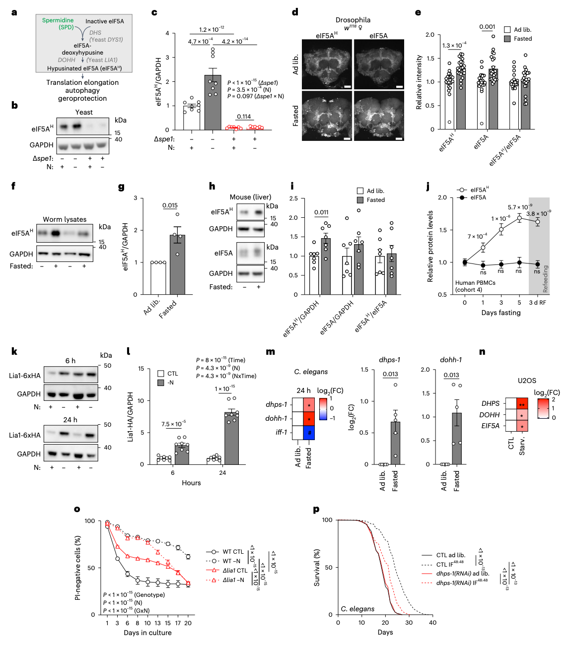 Mechanistically, spermidine mediates these effects by inducing autophagy and hypusination modification of the eukaryotic translation initiation factor eIF5A. The polyamine-hypusination axis serves as a phylogenetically conserved metabolic regulatory hub in fasting-mediated enhancement of autophagy and lifespan extension. Notably, the hypusination modification of eIF5A acts downstream of spermidine and mediates the longevity associated with intermittent fasting.